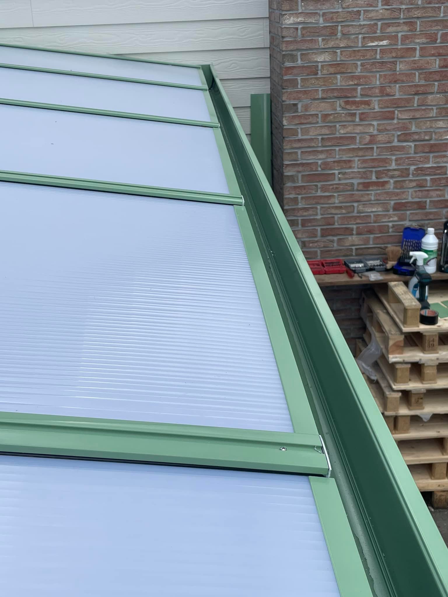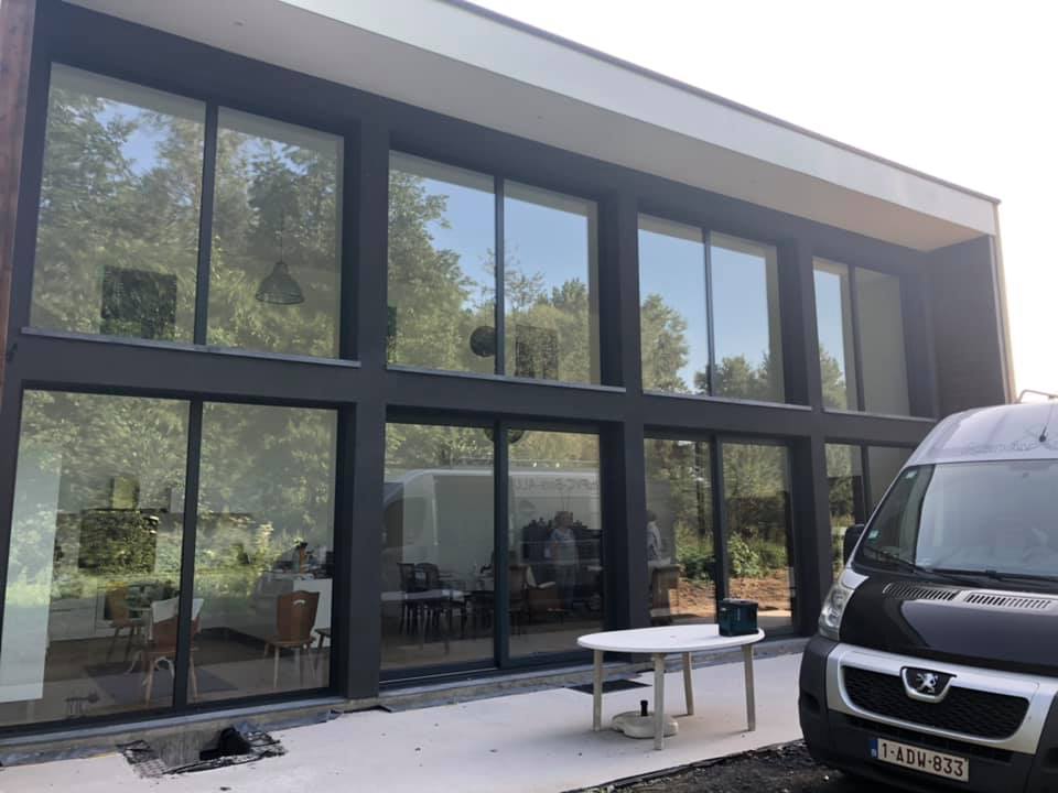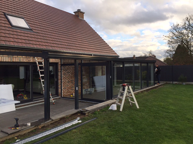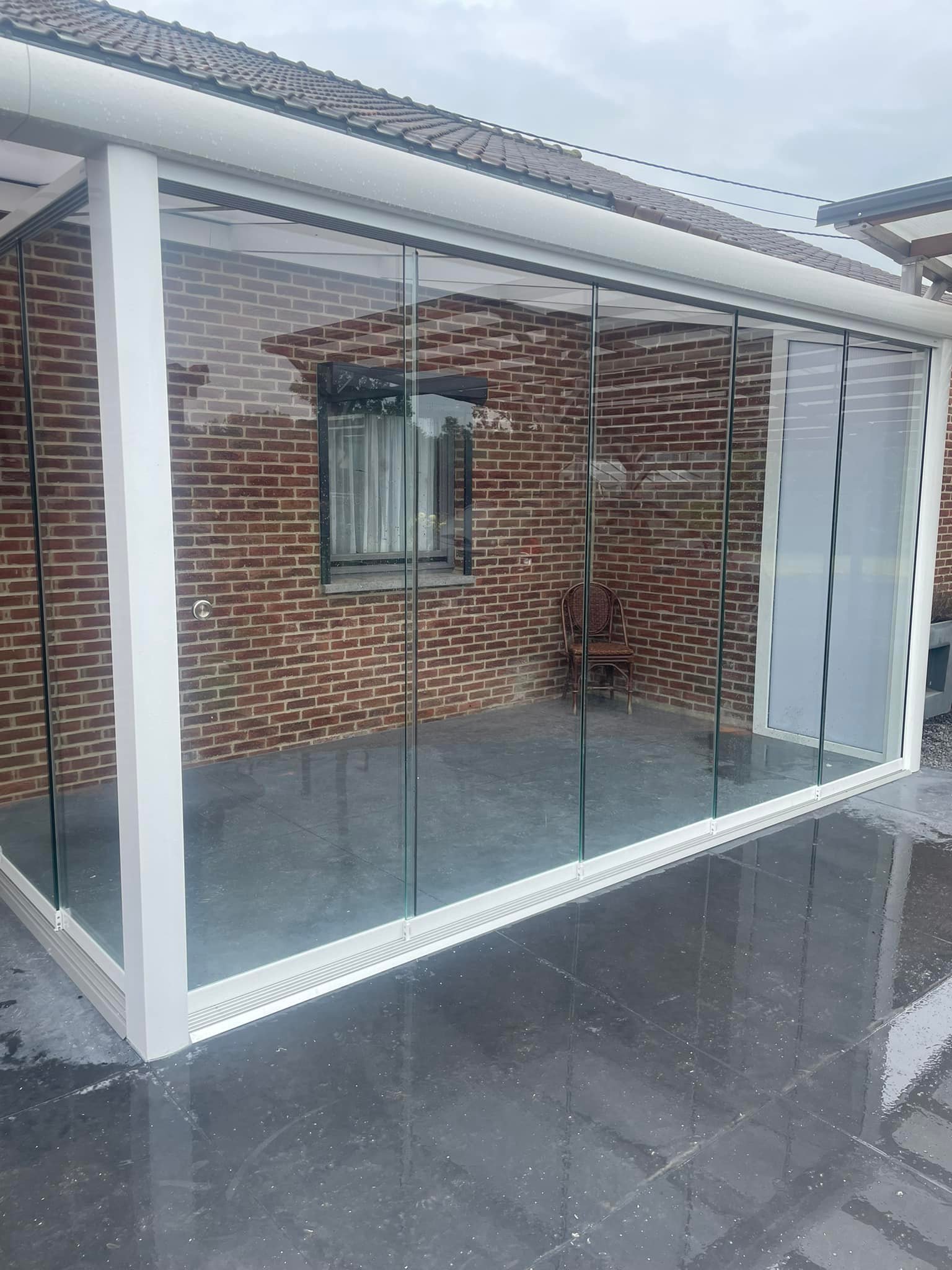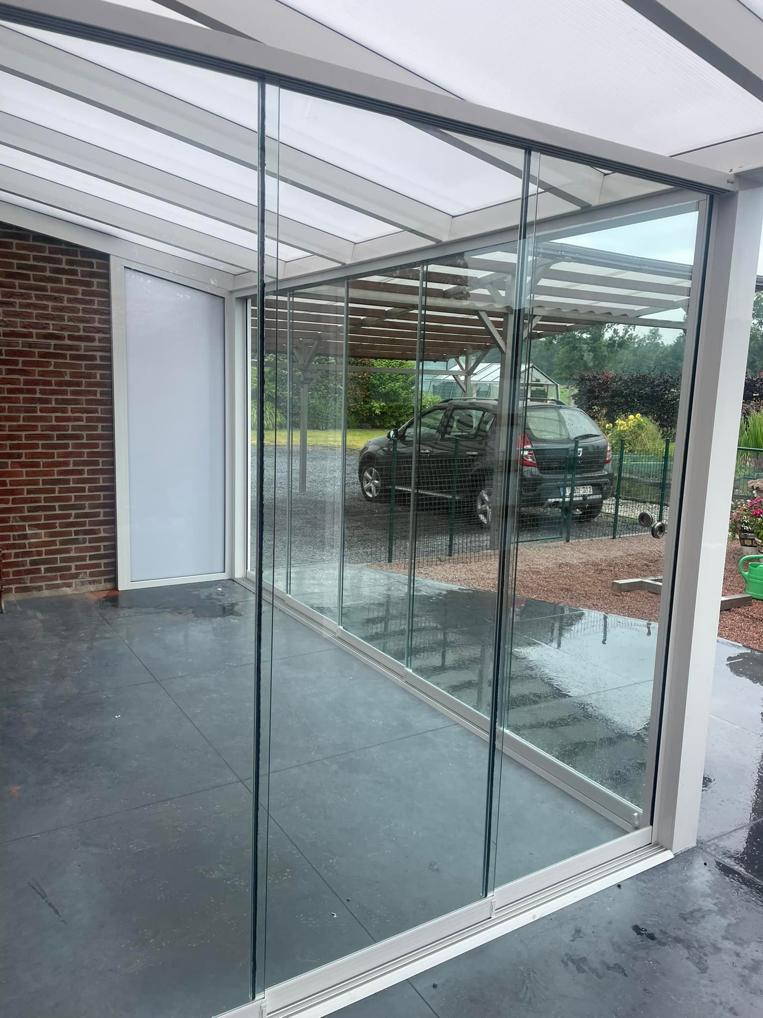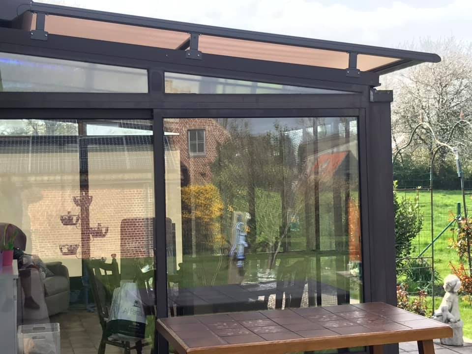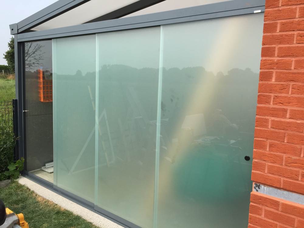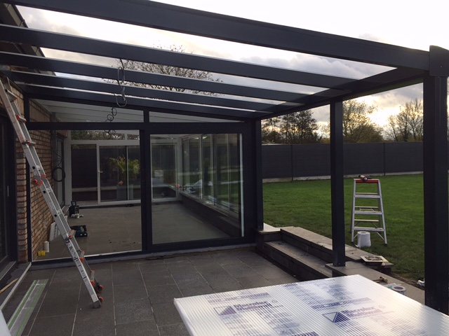 Toiture Alu porteuse - Dimensions 5 m x 3,5m - Vitrages Solaires de 32 mm d'épaisseur - Chantier à Antoing