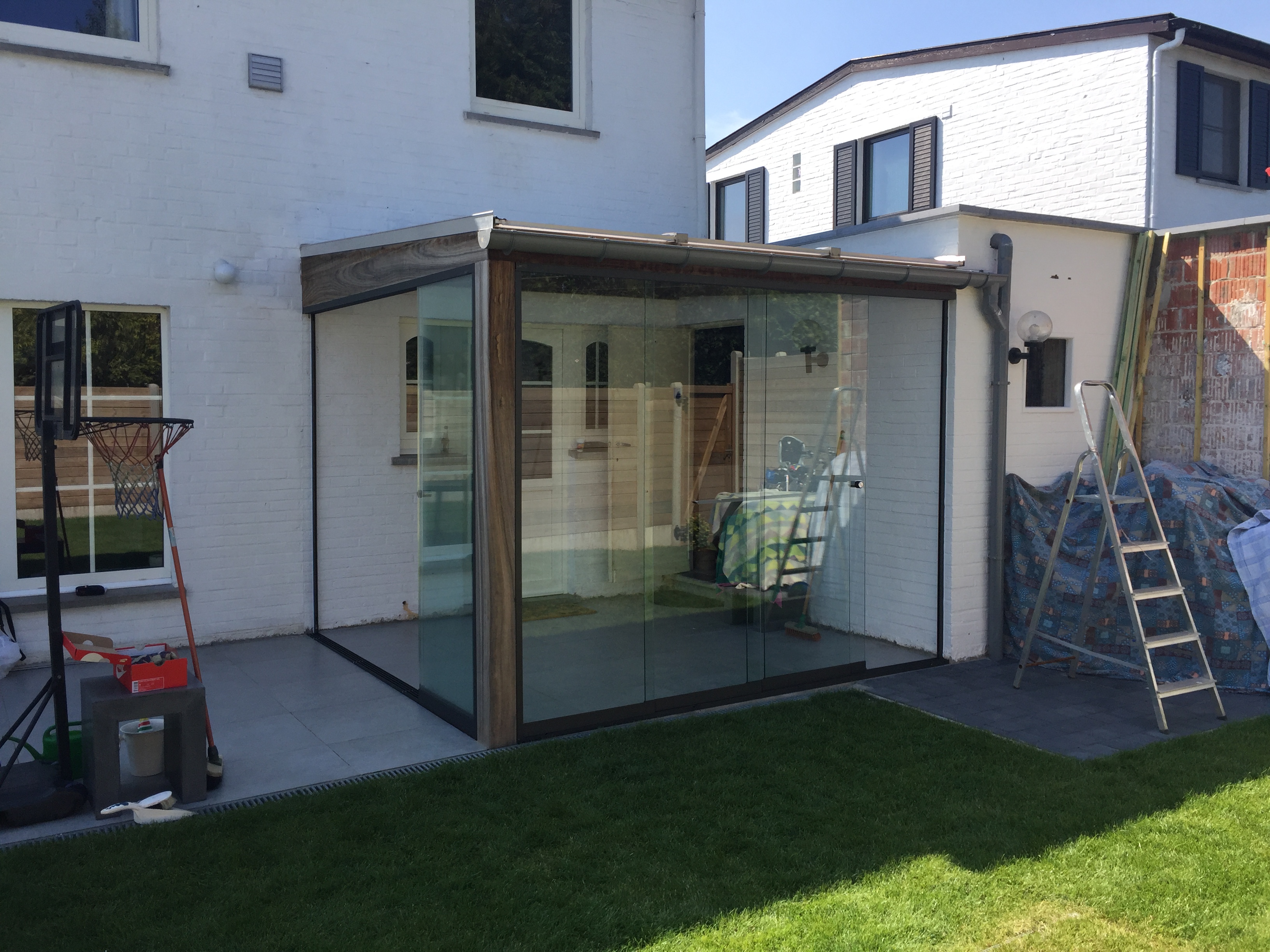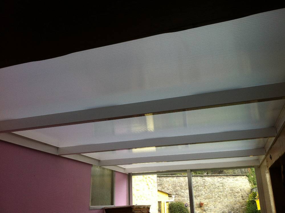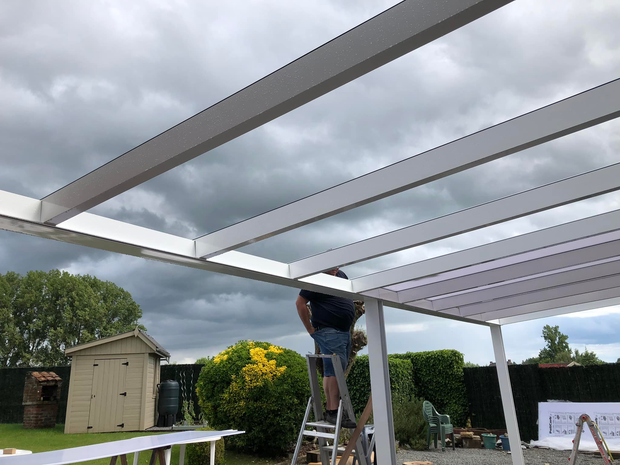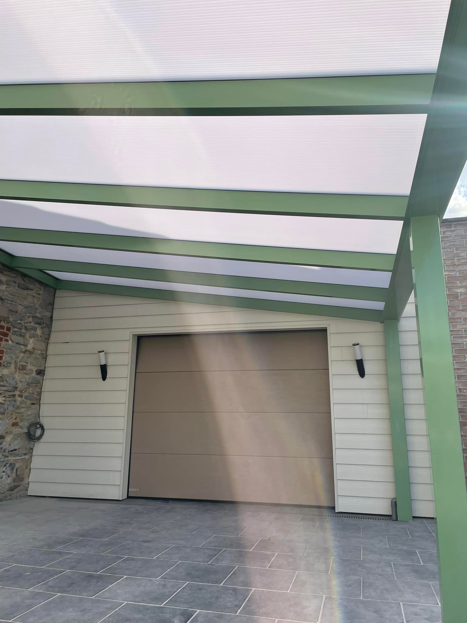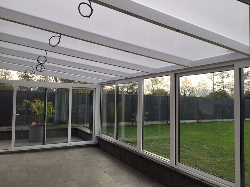 Toiture Alu porteuse - Dimensions 5 m x 3,5m - Vitrages Solaires de 32 mm d'épaisseur - Chantier à Antoing