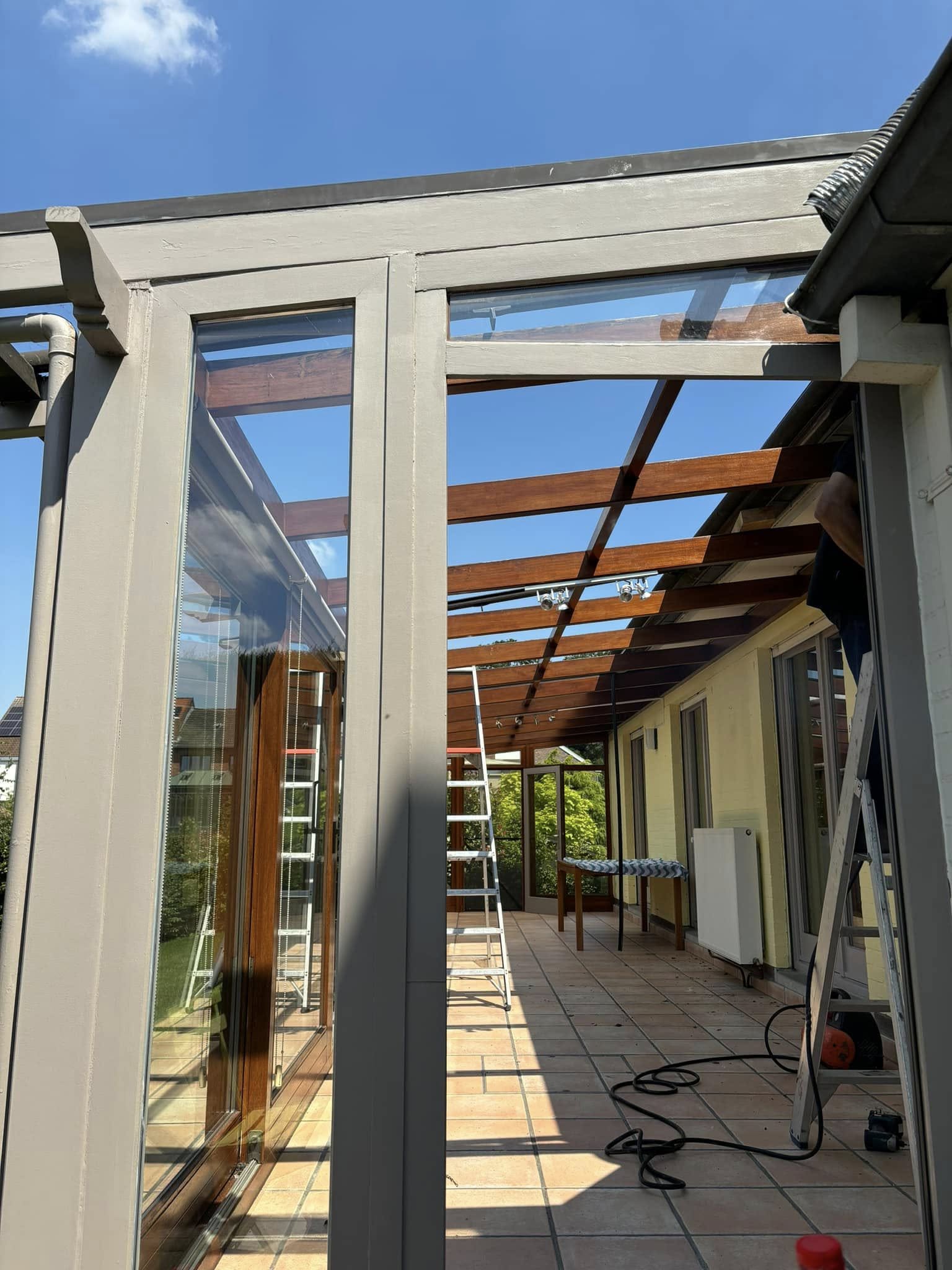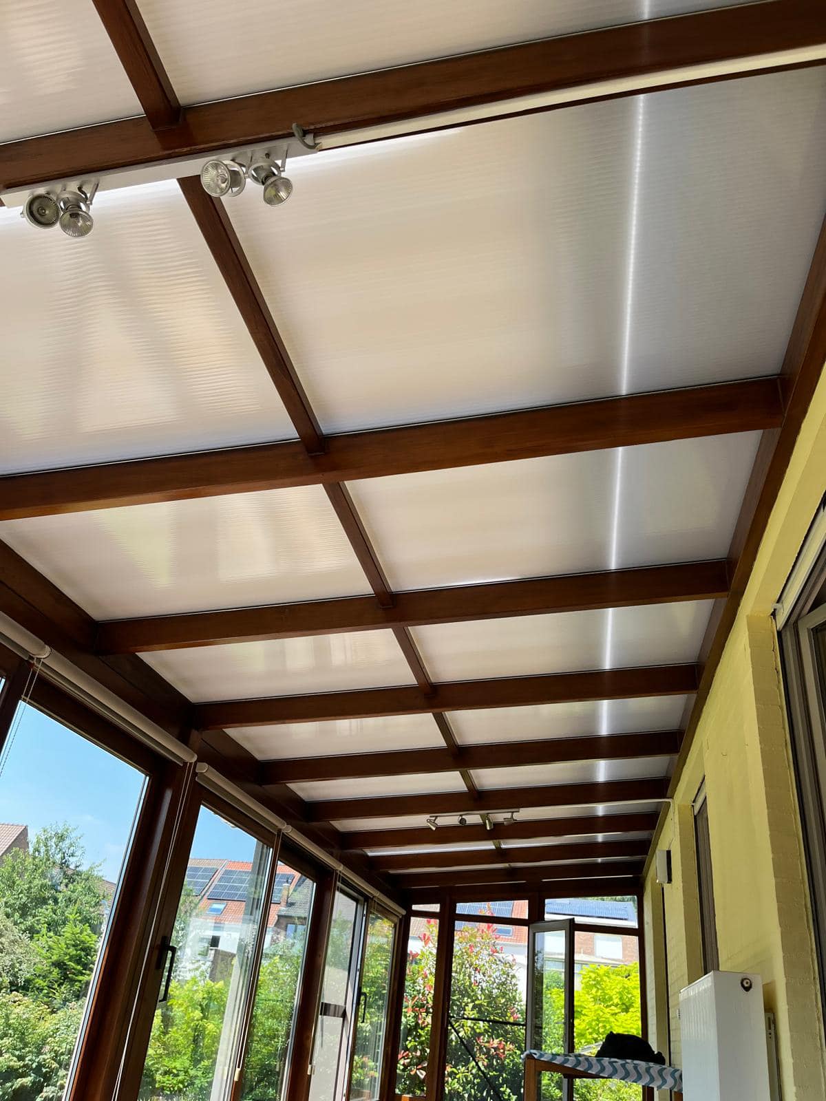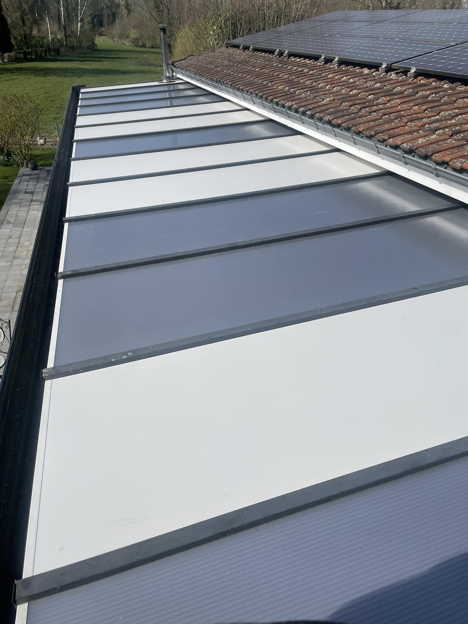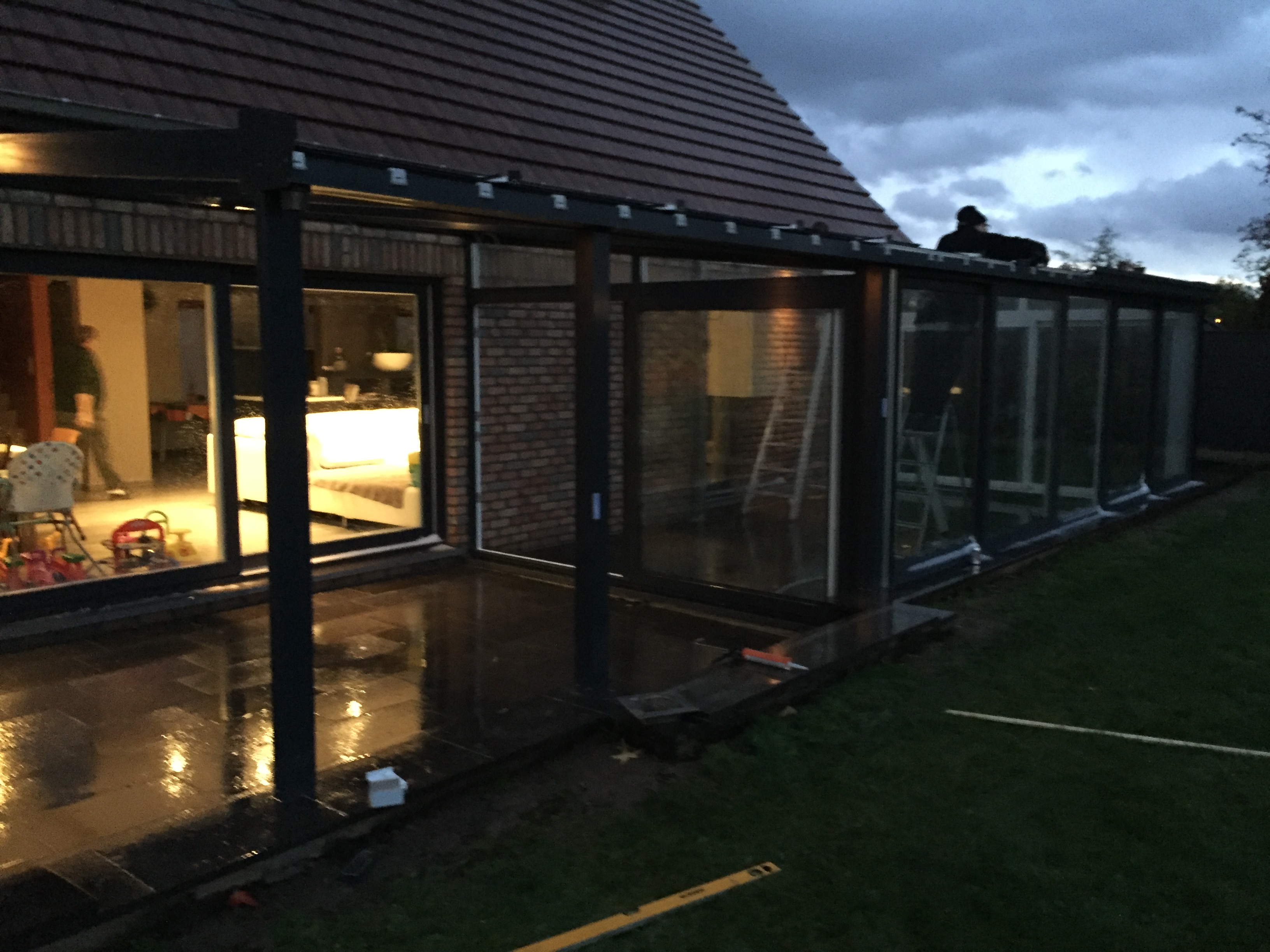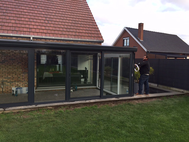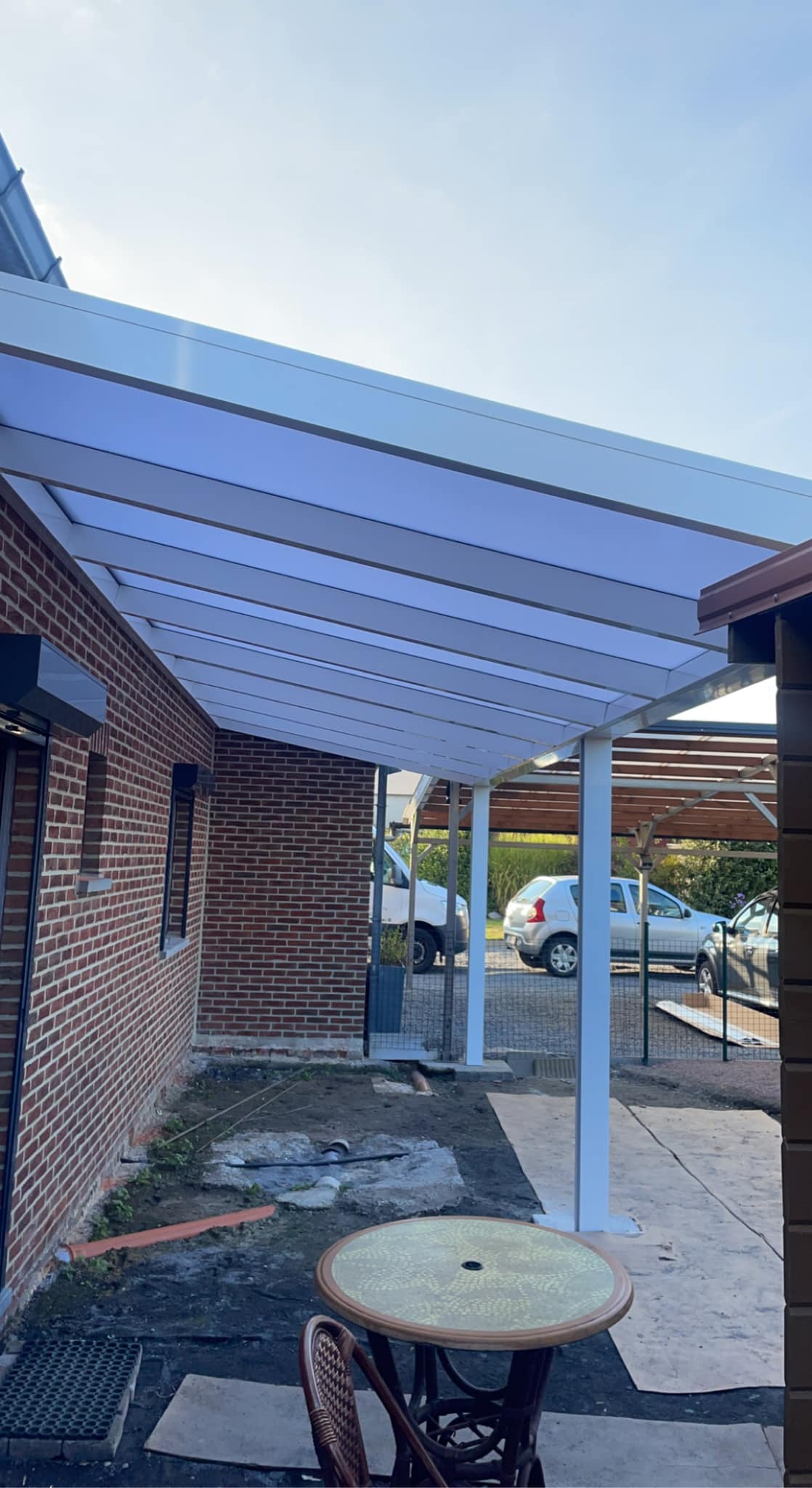Toiture Alu porteuse - Dimensions 5 m x 3,5m - Vitrages Solaires de 32 mm d'épaisseur - Chantier à Antoing