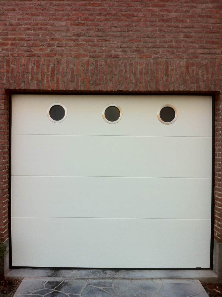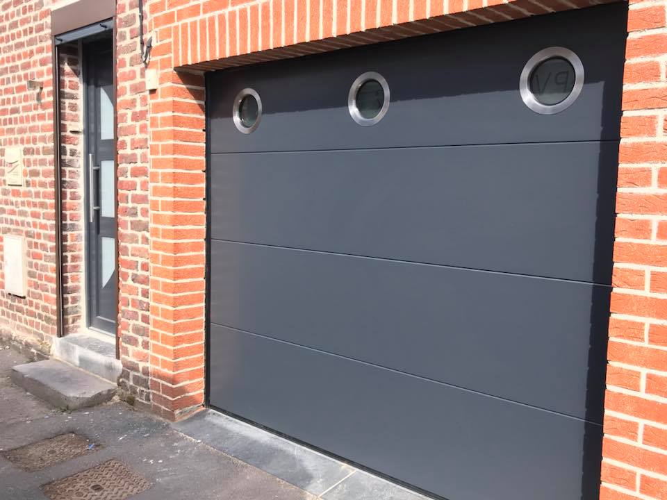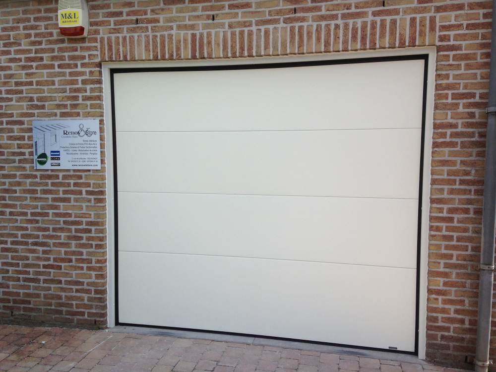Porte de Garage Harol SP 900 motorisée - Teinte RAL 9001 - Trois Hublots INOX et Vitrage de sécurité - Chantier à Tournai