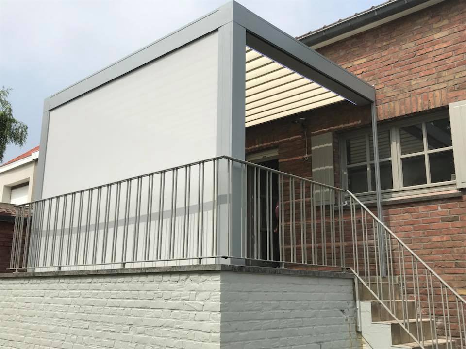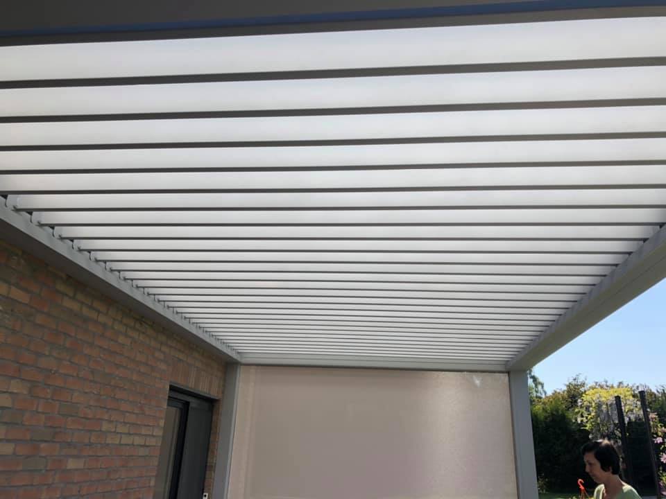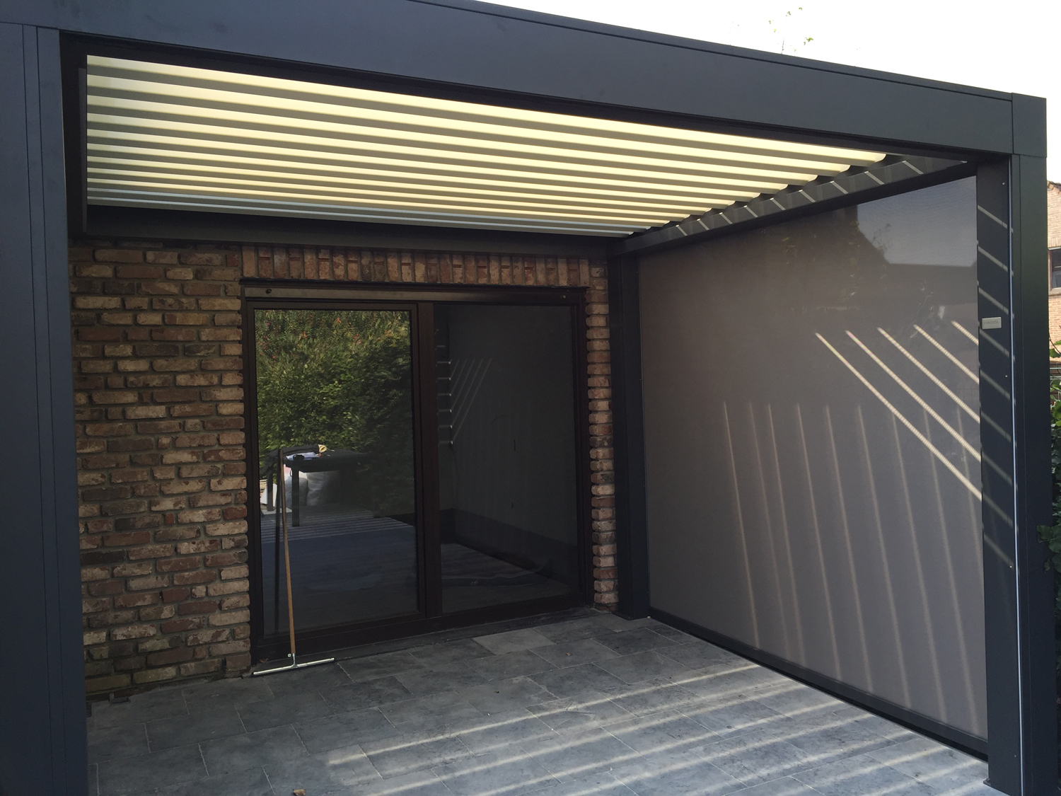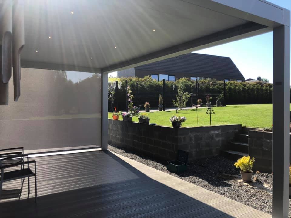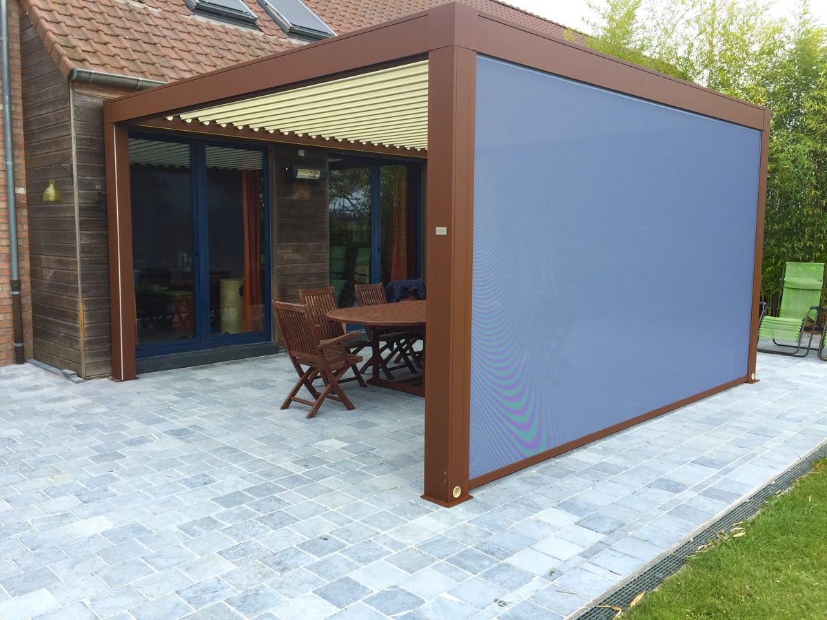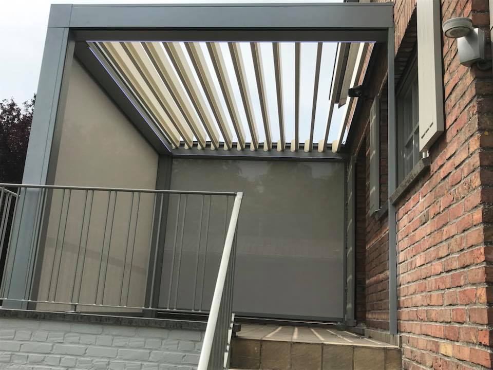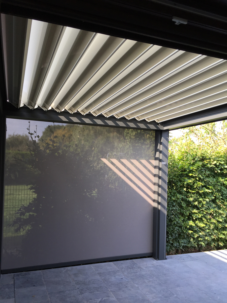 Pergola à lames inclinables et screen vertical (ici en position fermée)