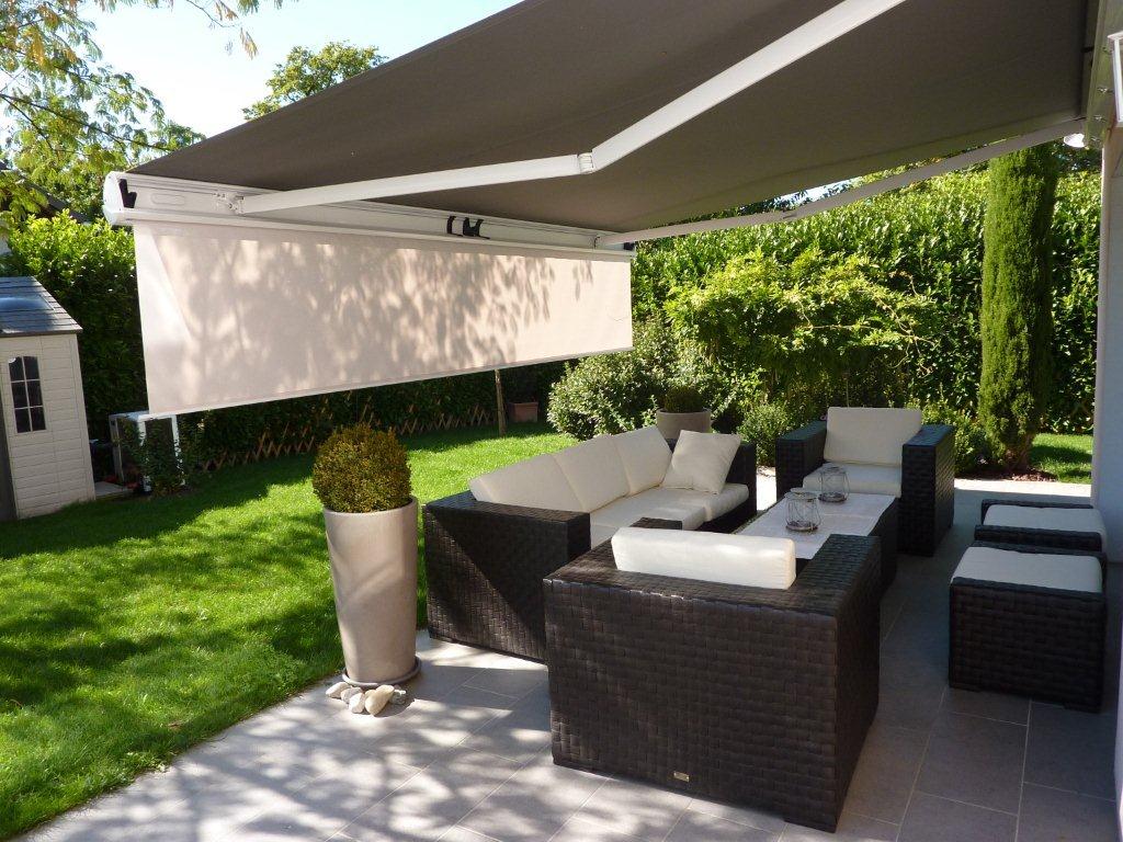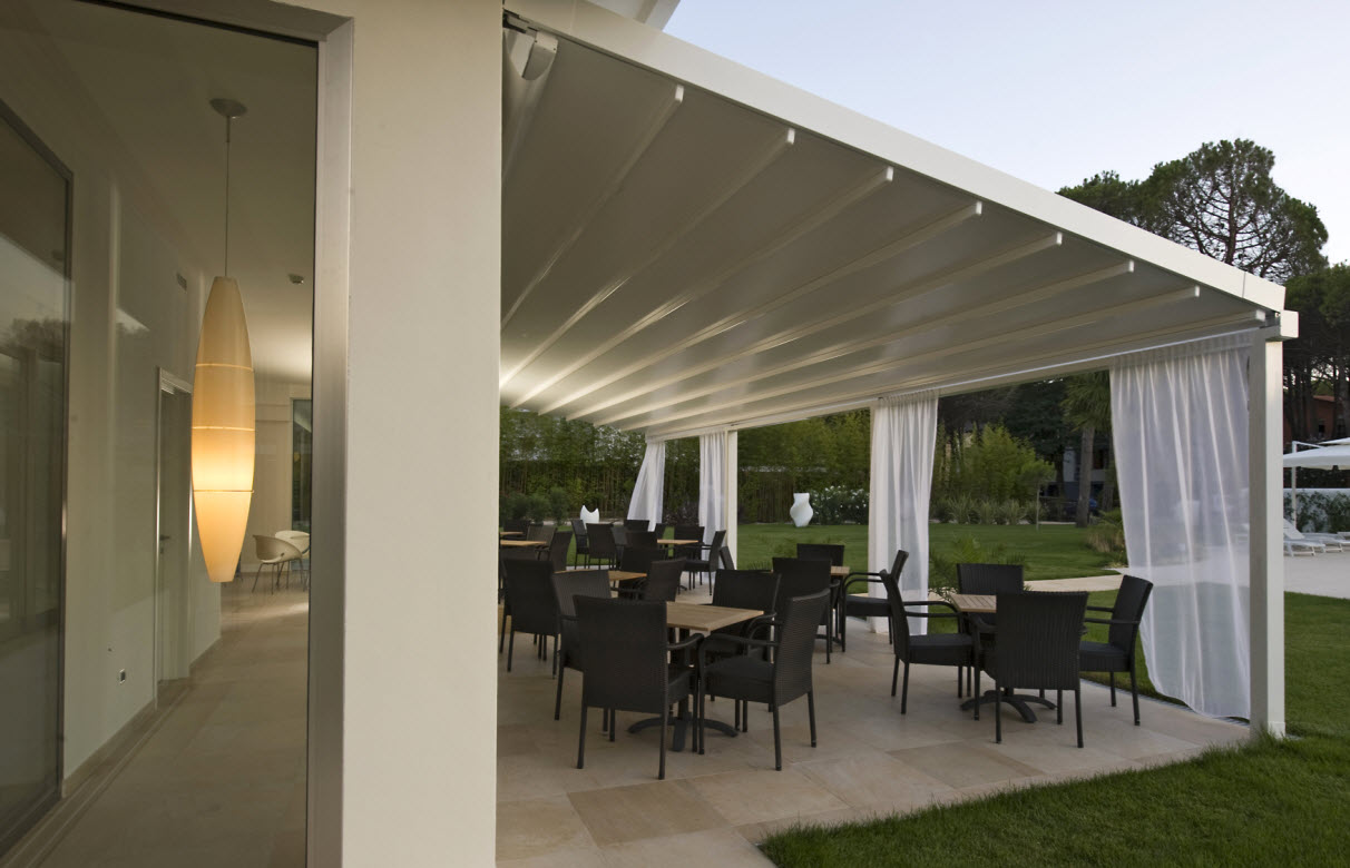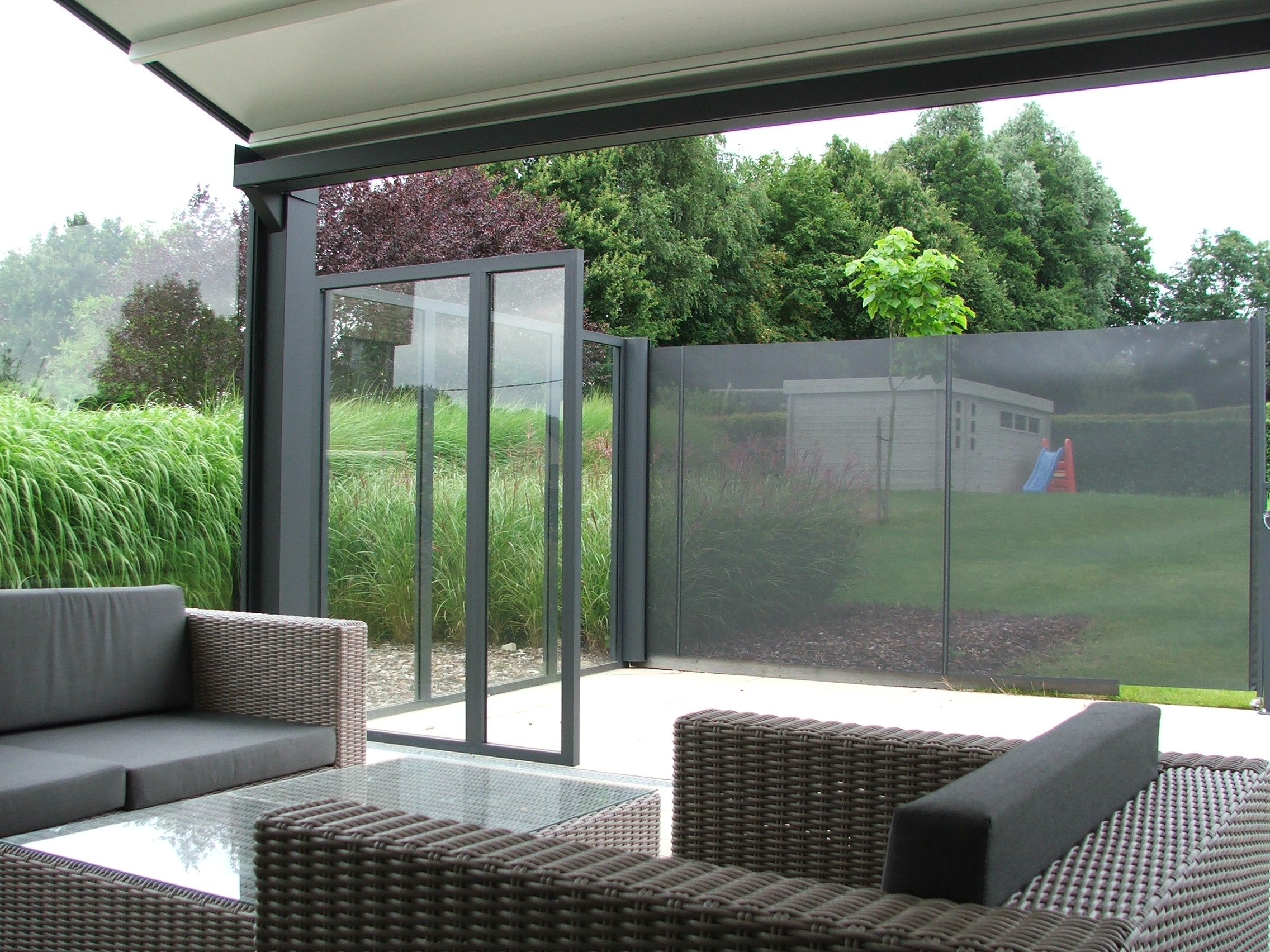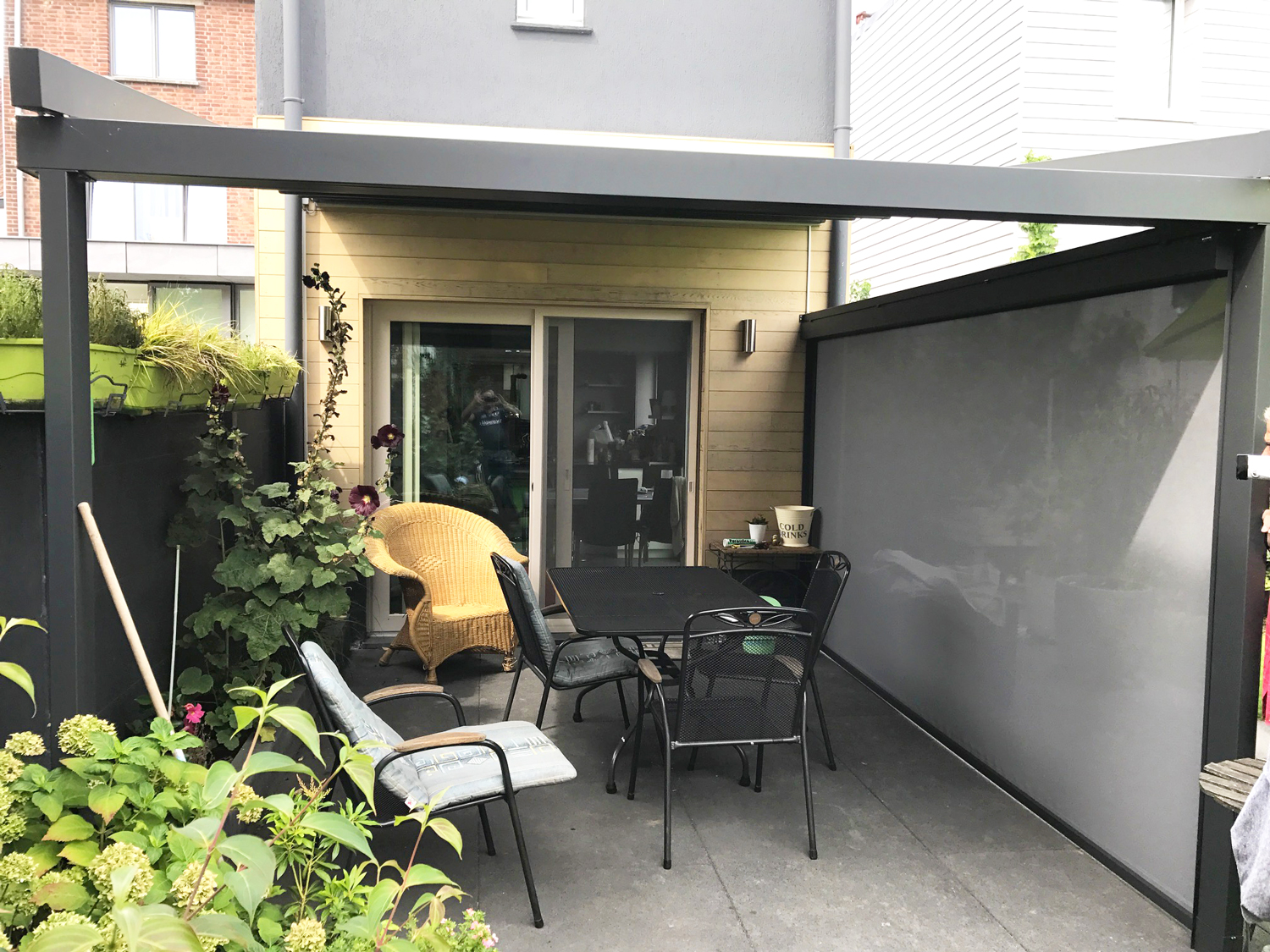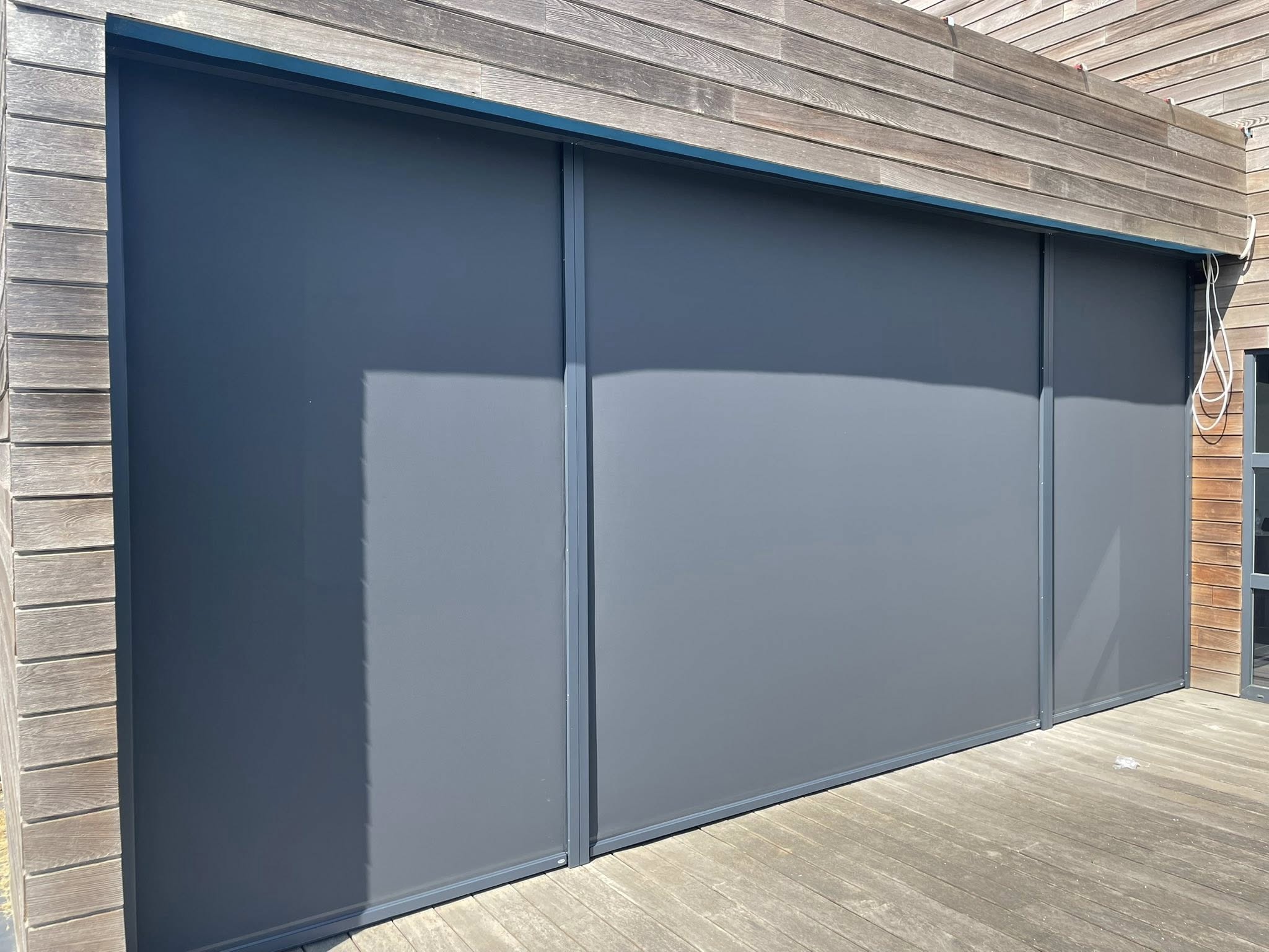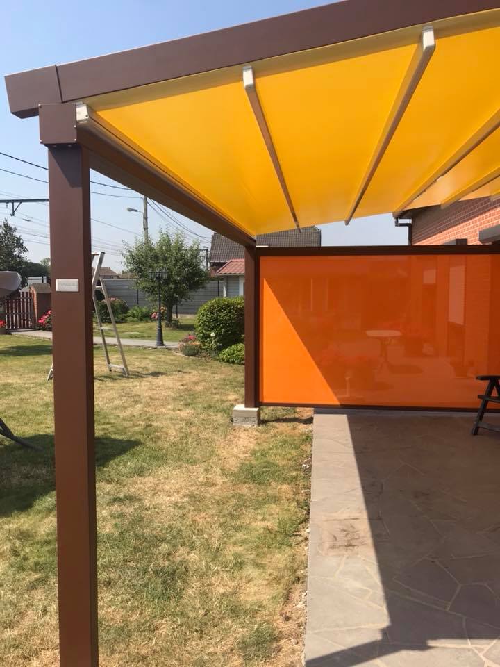 Pergola à lames inclinables et screen vertical (ici en position fermée)