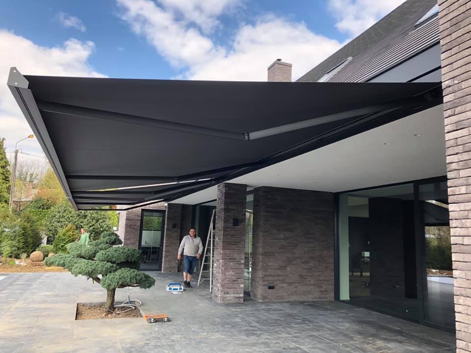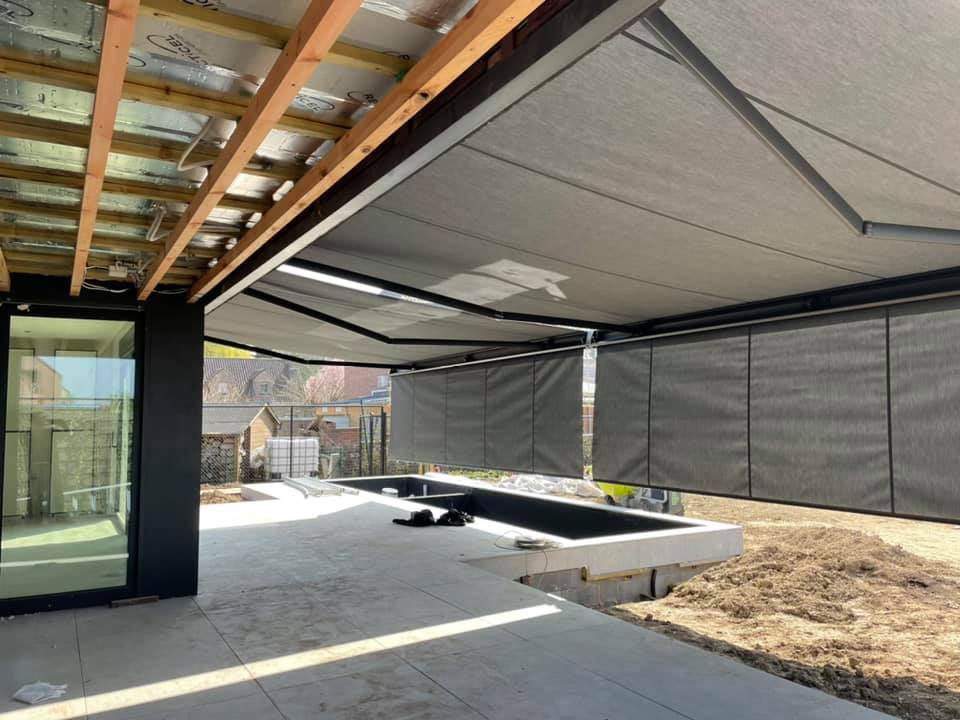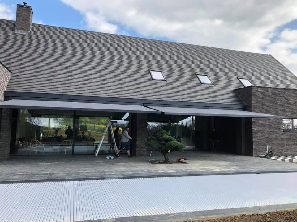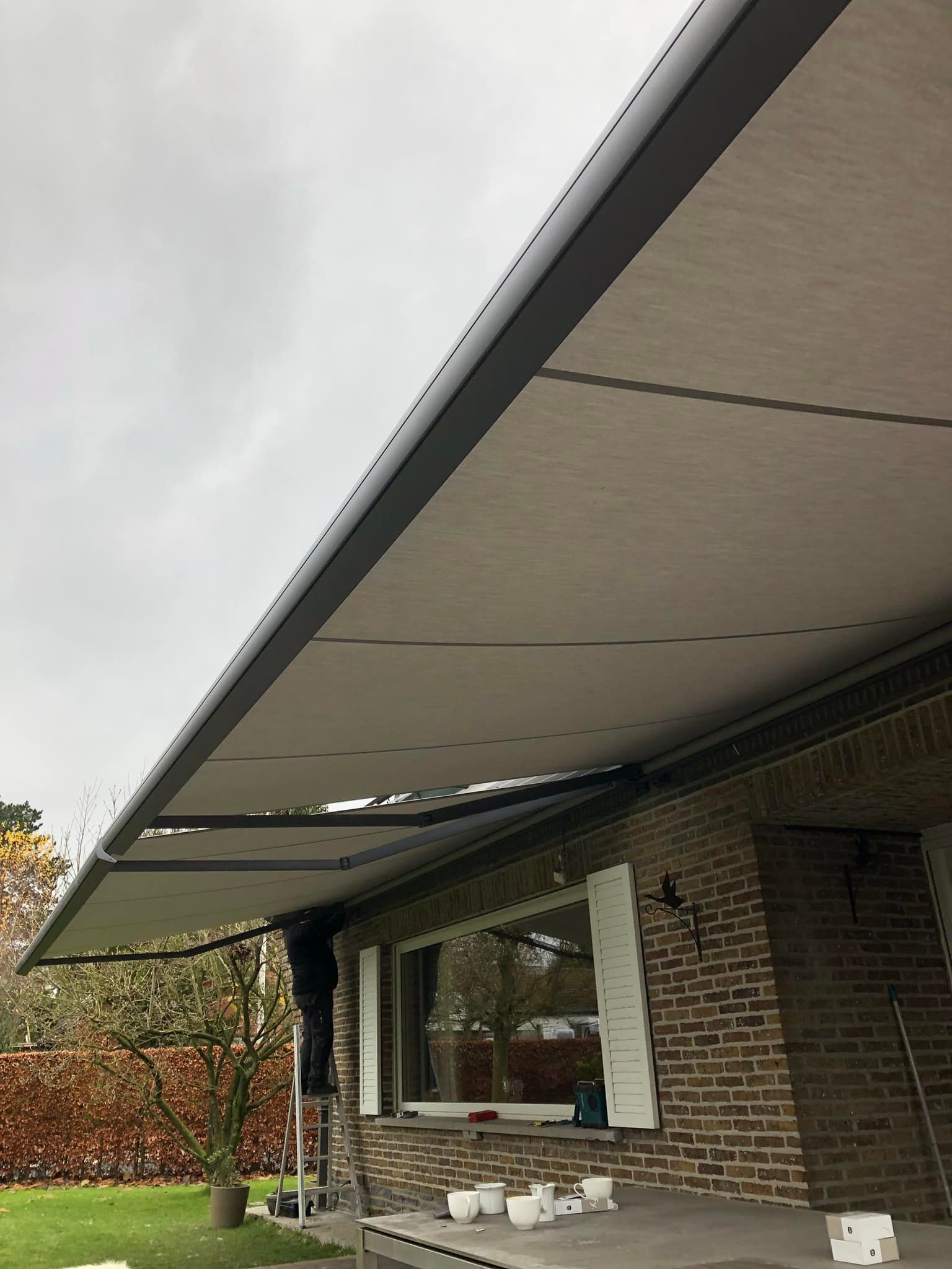 Protections Solaires Harol Vz 520 - Dimensions : 15m x 4 m, divisées en 3 parties-, Moteur Somfy RTS 2x - Ral Structuré 8019 - toile Soltis 92 beige - Chantier à Tournai