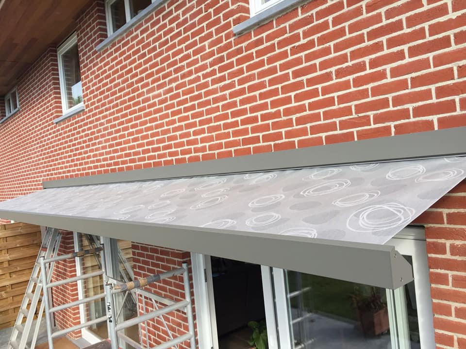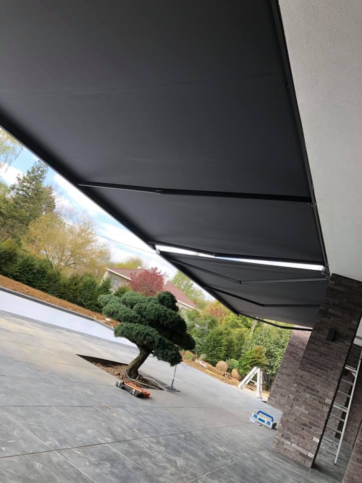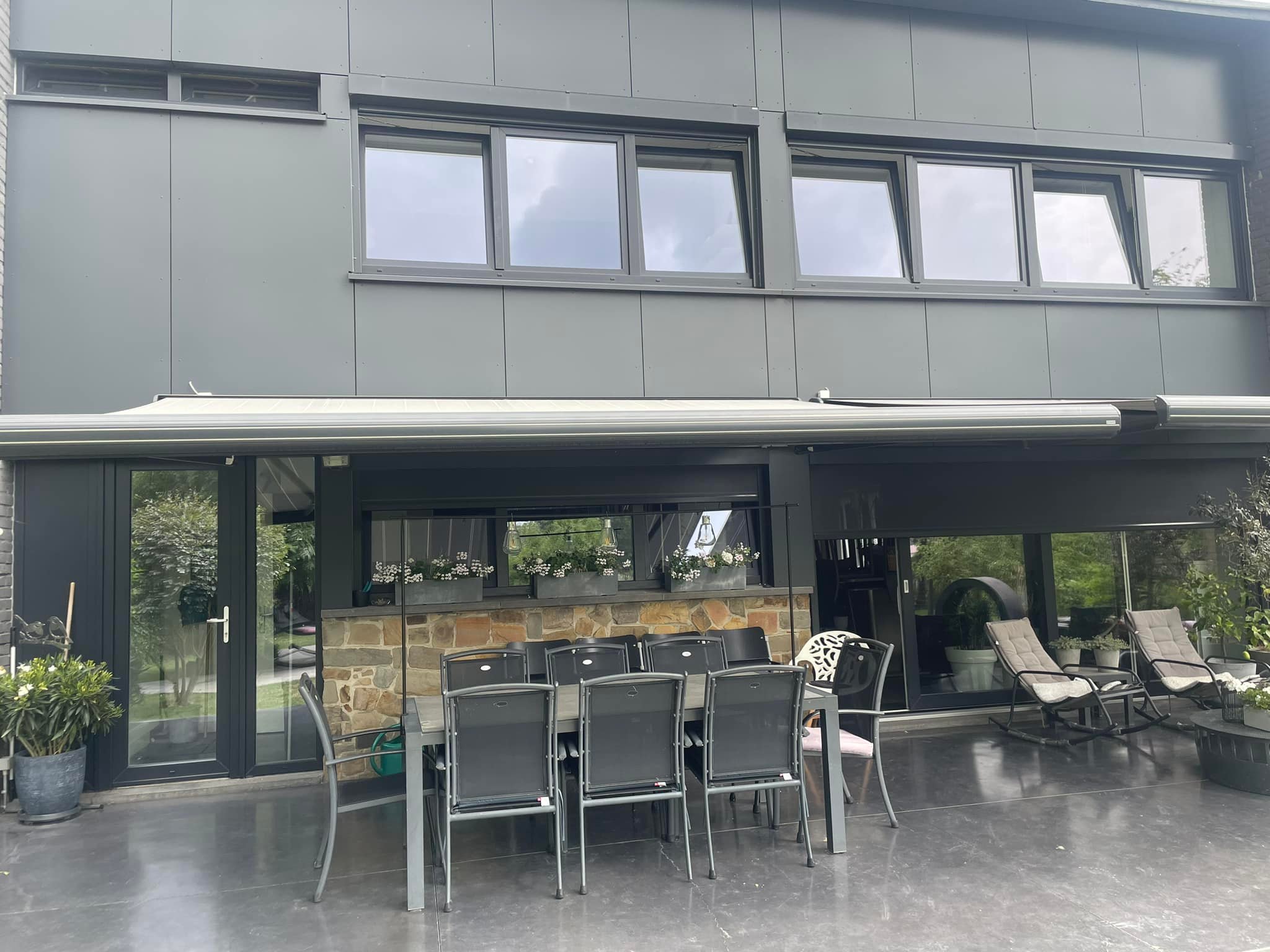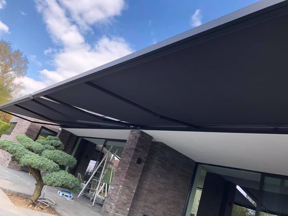 Protections Solaires Harol Vz 520 - Dimensions : 15m x 4 m, divisées en 3 parties-, Moteur Somfy RTS 2x - Ral Structuré 8019 - toile Soltis 92 beige - Chantier à Tournai
