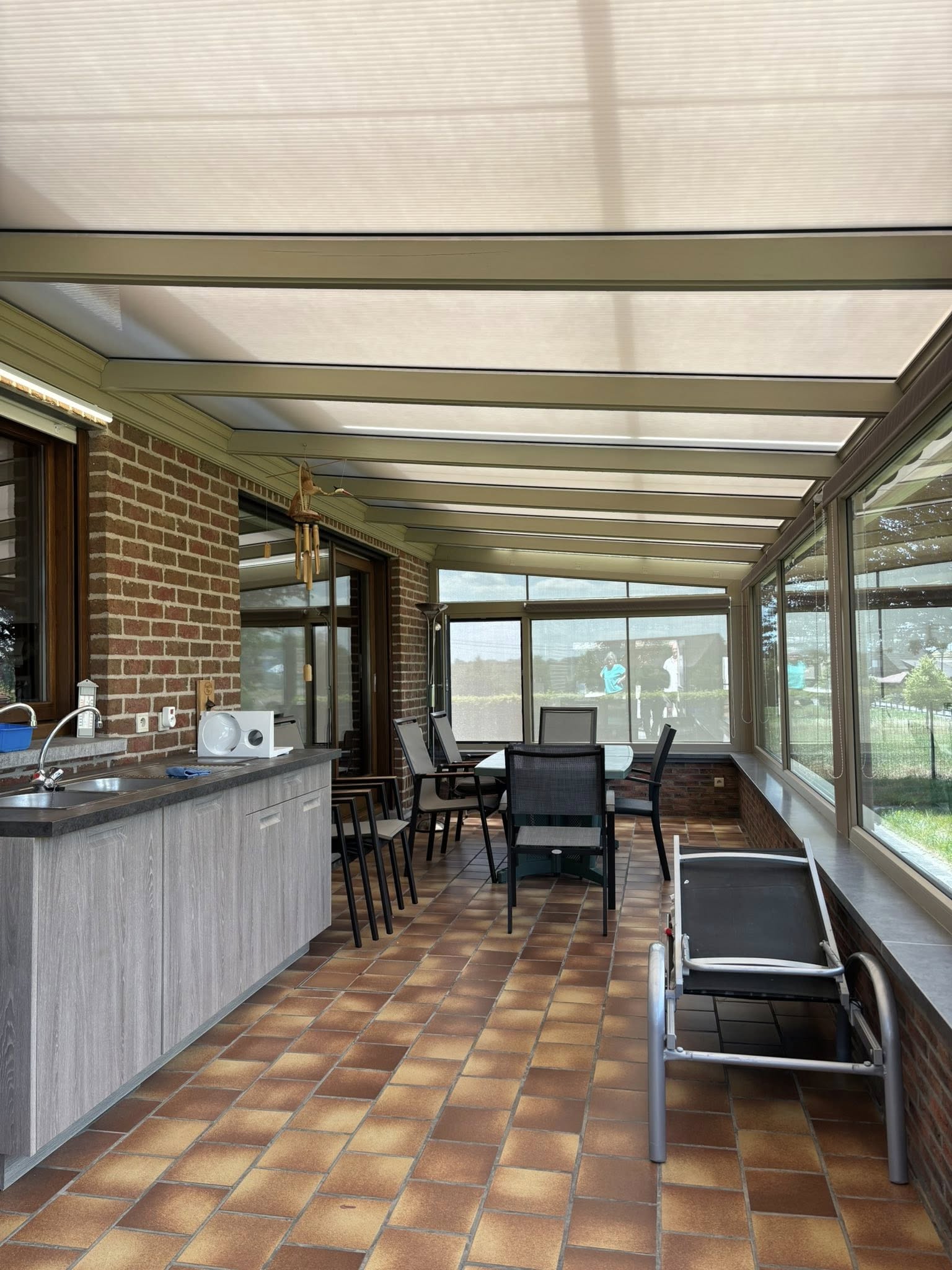 Protection Solaire Harol sur toiture de veranda VZ 520 - Teinte RAL Structuré 8019 - Toile Soltis 92 - Chantier à Gallaix
